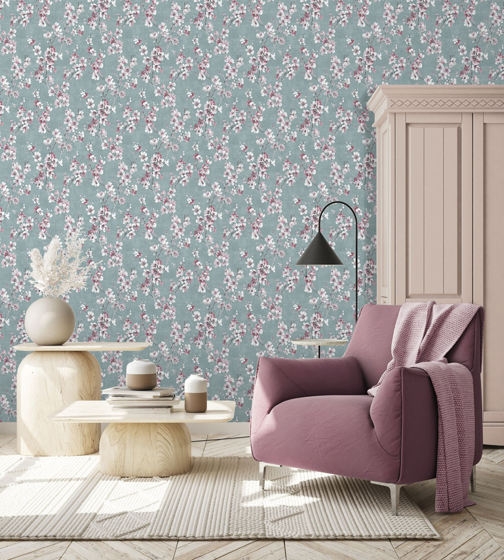 Diese blaue Tapete mit Blumenmuster bringt Frische und Lebendigkeit in jeden Raum. Ideal für Wohnzimmer und Esszimmer.