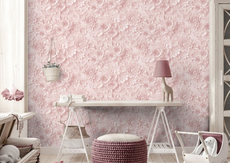 Die rosa Blumentapete mit 3D-Effekt schafft eine lebendige und tiefgründige Atmosphäre, perfekt für moderne und stilvolle Wohnräume.