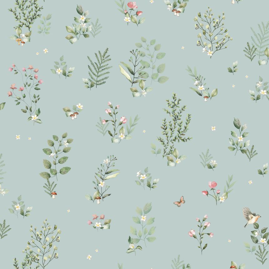 Türkise Vliestapete mit Pflanzen und Vögeln, 973-2, Mika,  ICH Wallcoverings Türkise Vliestapete mit Pflanzen und Vögeln, 973-2, Mika,  ICH Wallcoverings