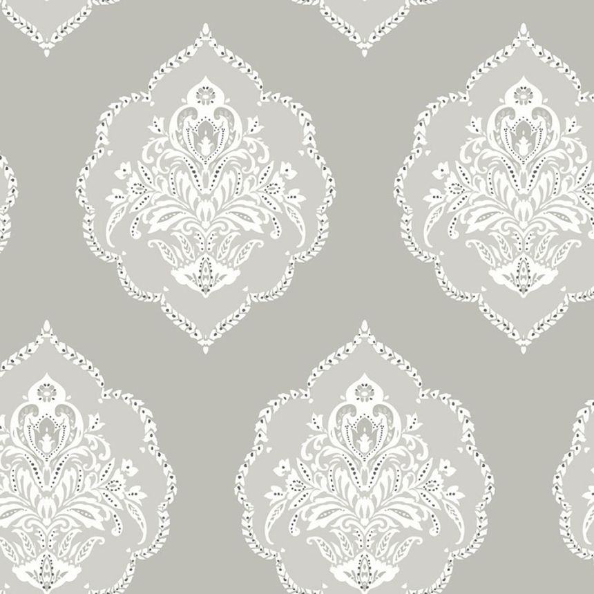 Grau-beige vorgeklebte Tapete mit Ornamenten DM5034, Damask, York Grau-beige vorgeklebte Tapete mit Ornamenten DM5034, Damask, York