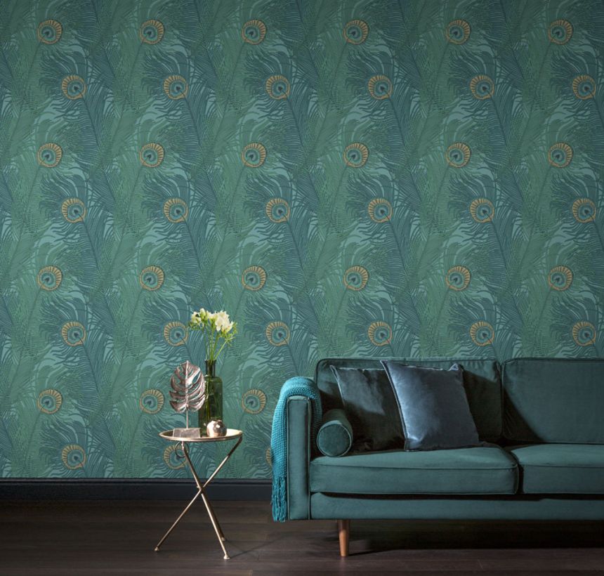 Vliestapete, grün, Pfauenfedern, NHW1045, Perla, Decoprint Vliestapete, grün, Pfauenfedern, NHW1045, Perla, Decoprint
