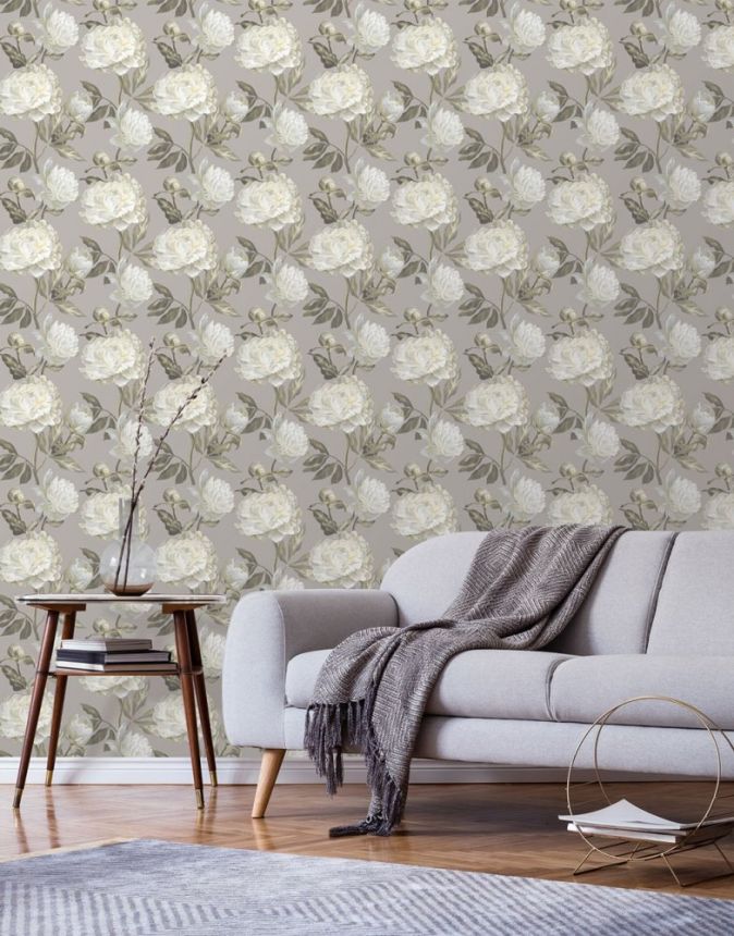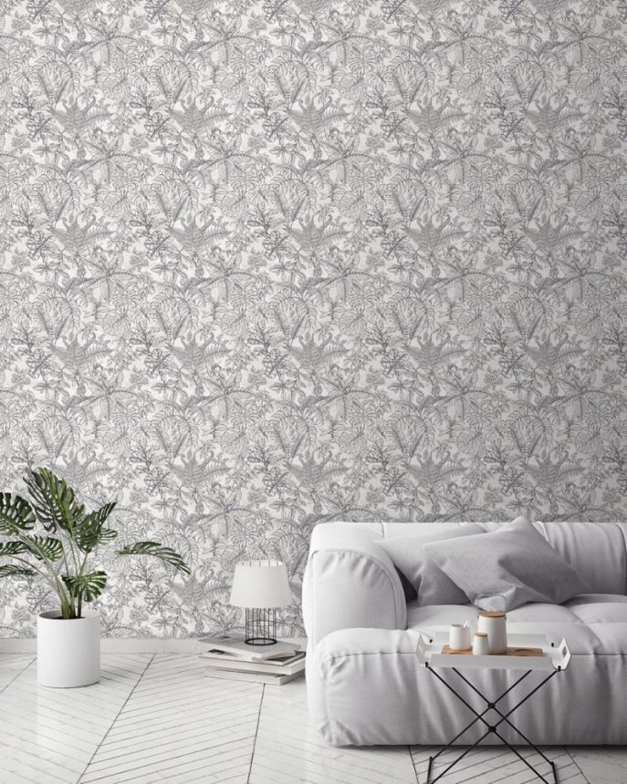 Grau-beige Tapete mit Blumen und Vögeln, 28841, Thema, Cristiana Masi by Parato Grau-beige Tapete mit Blumen und Vögeln, 28841, Thema, Cristiana Masi by Parato