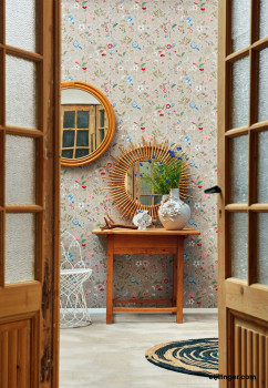Vliestapete mit Naturmotiven - Blumen, Schmetterlinge, Tiermotive auf grauem Hintergrund.