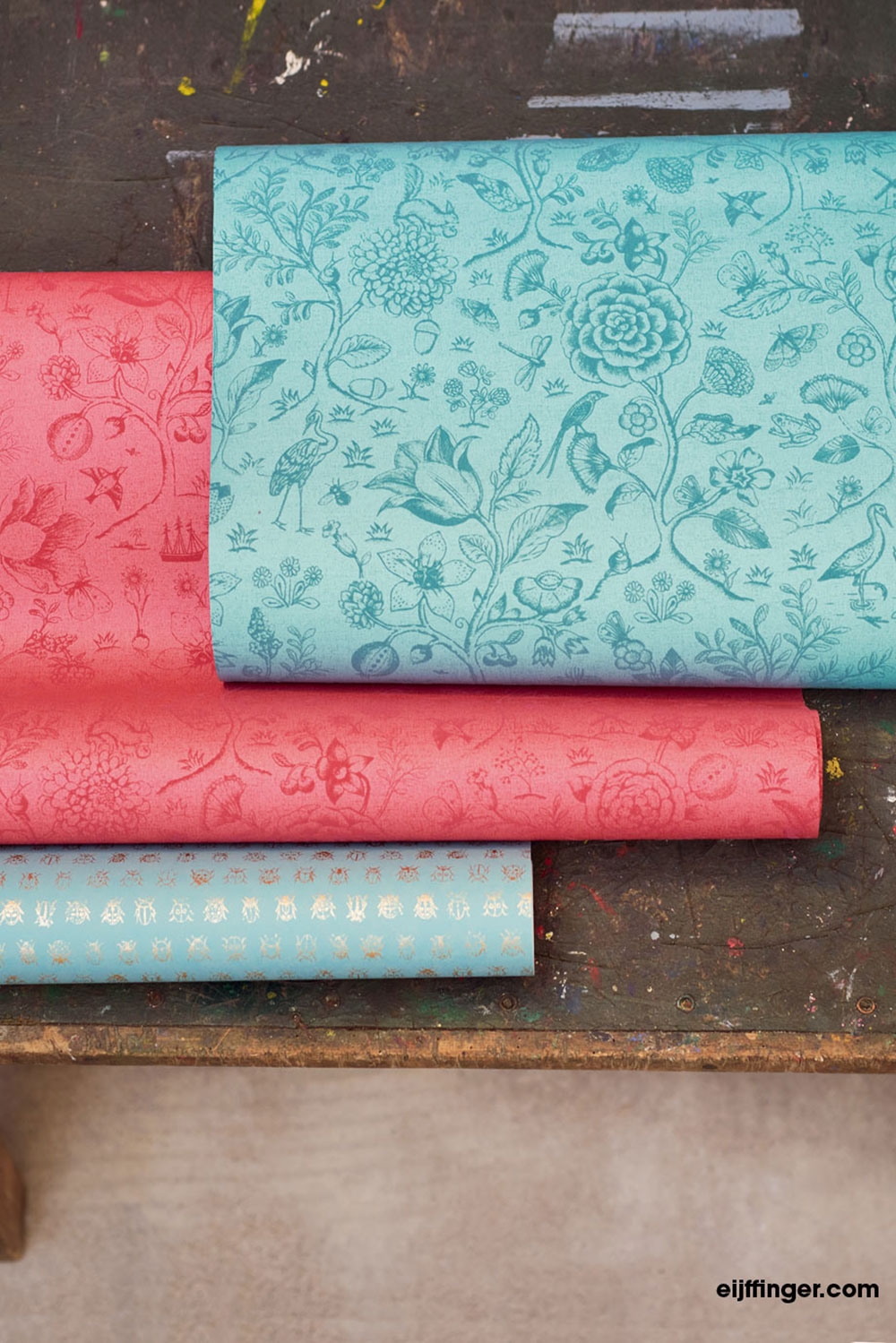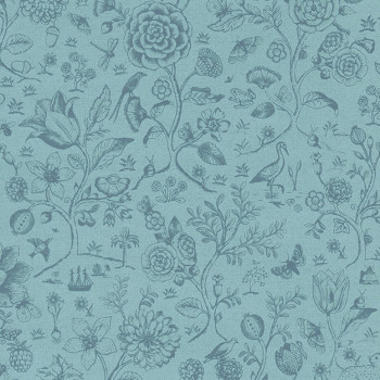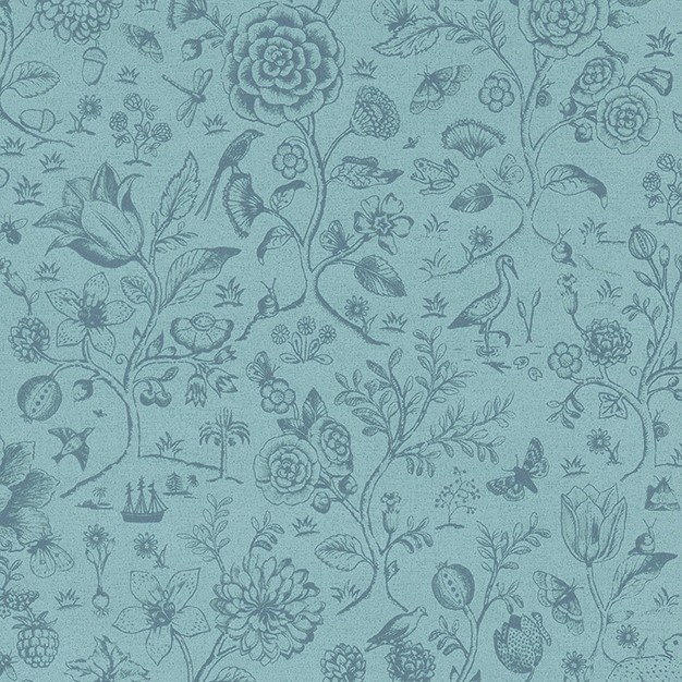 Vliestapete mit Naturmotiven - Blumen, Schmetterlinge, Tiermotive in sanften Blautönen.