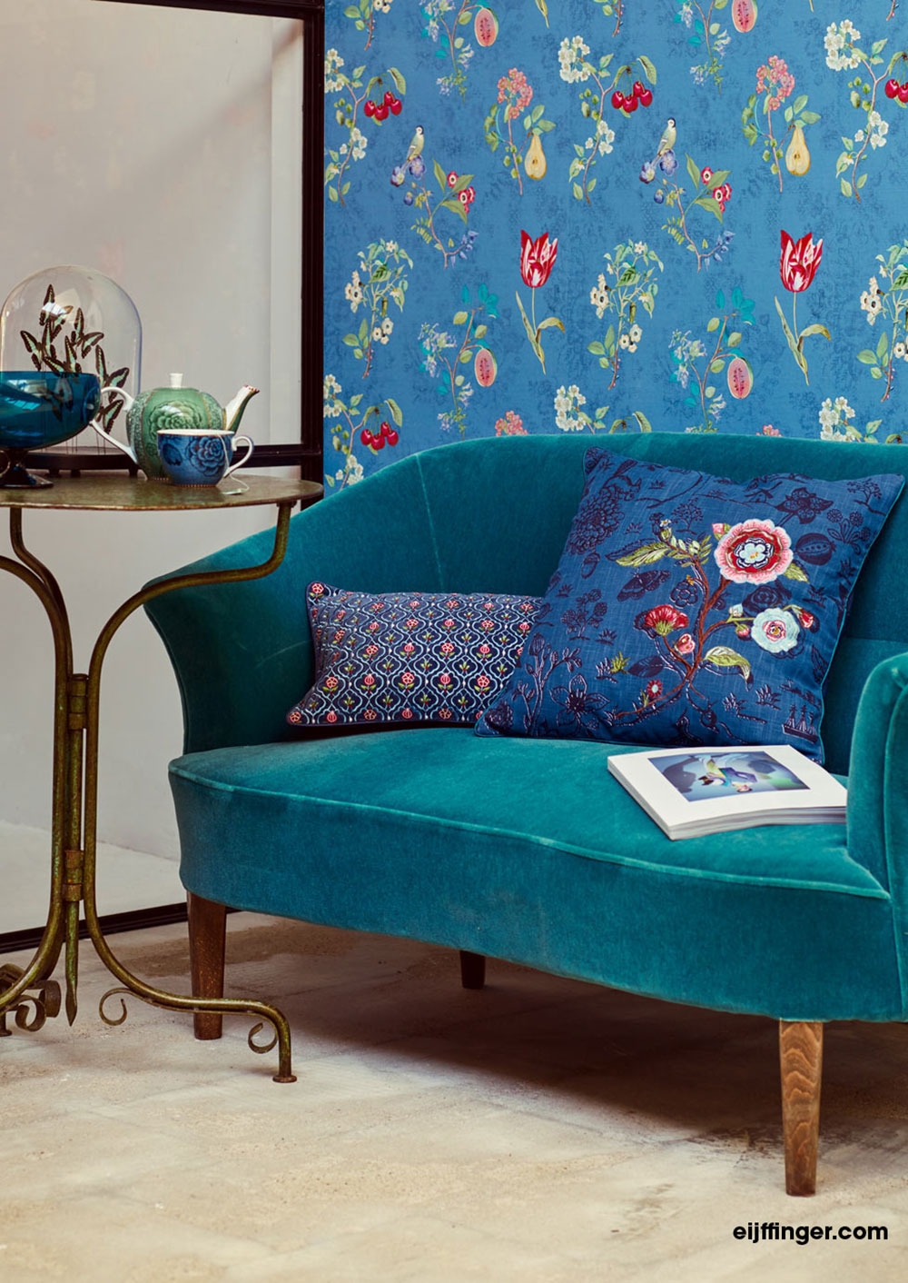 Naturmotive - Blumen, Zweige, Obst, Vögel, auf hellblauer Vliestapete.
