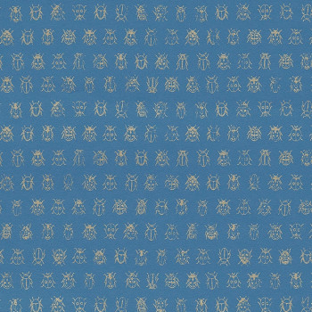 Regelmäßiges Muster mit goldenen Käfern auf tiefblauer Vliestapete.