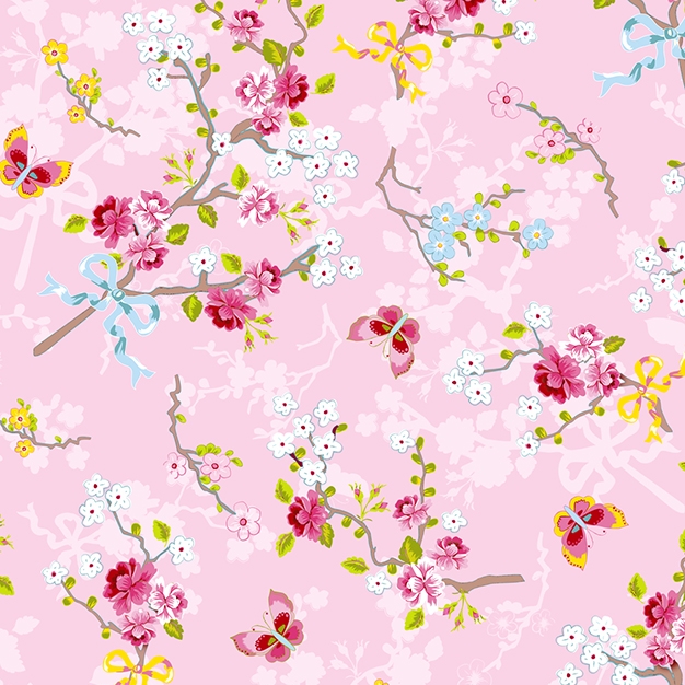 Das romantische Design bringt Ruhe und Entspannung in den Innenraum. Blühende Zweige und Schmetterlinge auf einer rosa Vliestapete.