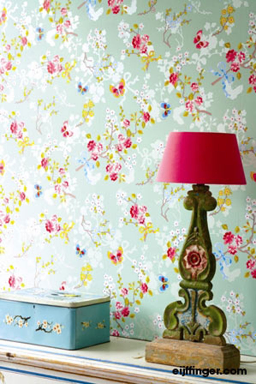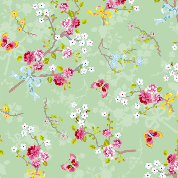 Das romantische Design bringt Ruhe und Entspannung in den Innenraum. Blühende Zweige und Schmetterlinge auf grüner Vliestapete.