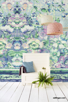Schöne Wandbilder Tapete mit floralem, Muster in blauen, grünen und türkisfarbenen Tönen. Obwohl die Tapete im Kindertapetenkatalog platziert ist, ist sie auch geeignet, um Ihr Wohnzimmer oder Schlafzimmer Interieur zu ergänzen.