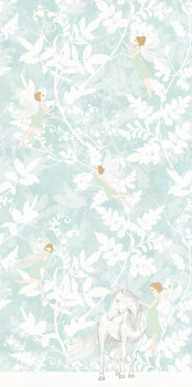 Einhorn mit Feen auf einer blau-weißen Tapete Wandbilder mit Naturmotiven.