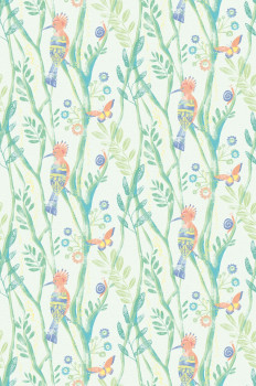 Vögel und Schmetterlinge auf Tapeten mit Pflanzenmotiven.