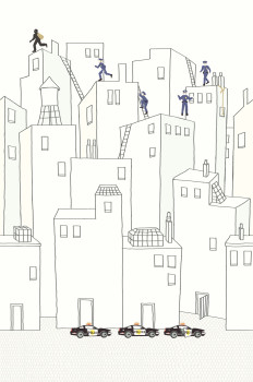 Schwarzweiße Häuser - Polizeieinsatz auf Tapete Wandbilder.