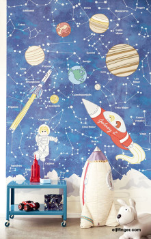 Welcher Junge wollte nicht schon einmal ins Weltall reisen? Astronaut, Raketen und Sternbilder am Himmel - Tapete Wandbilder. Etwas für kleine Abenteurer.