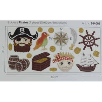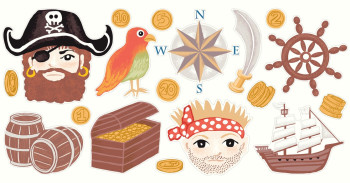 18 Stück Aufkleber mit maritimen Motiven - Schiffe, Matrosen, Truhe voller Gold, die Sie einzeln an der Wand anbringen oder auf die fein gestreifte Tapete kleben können.