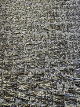 Moderne, effektvolle Vliestapete mit unkonventionellem Design – Hintergrundimitation eines feinen graubraunen halbglänzenden Stoffes, Tapetenstruktur aus blauen und goldenen metallischen „Fasern“.