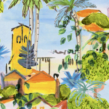 Inspiriert von französischen Avantgarde-Malern wie Matisse und Raoul Duf bringen die Tapeten handgemalte, skizzierte Landschaften, Palmen oder Blumenvasen an die Wände Ihres Zuhauses wie in einem Landhaus. Der Amazonas stand Pate für die zweite Designgruppe mit Palmblättern, Orchideenblüten und versteckten Chamäleons.