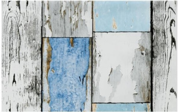 Selbstklebefolie mit grau-blauem Plankenholzdekor.