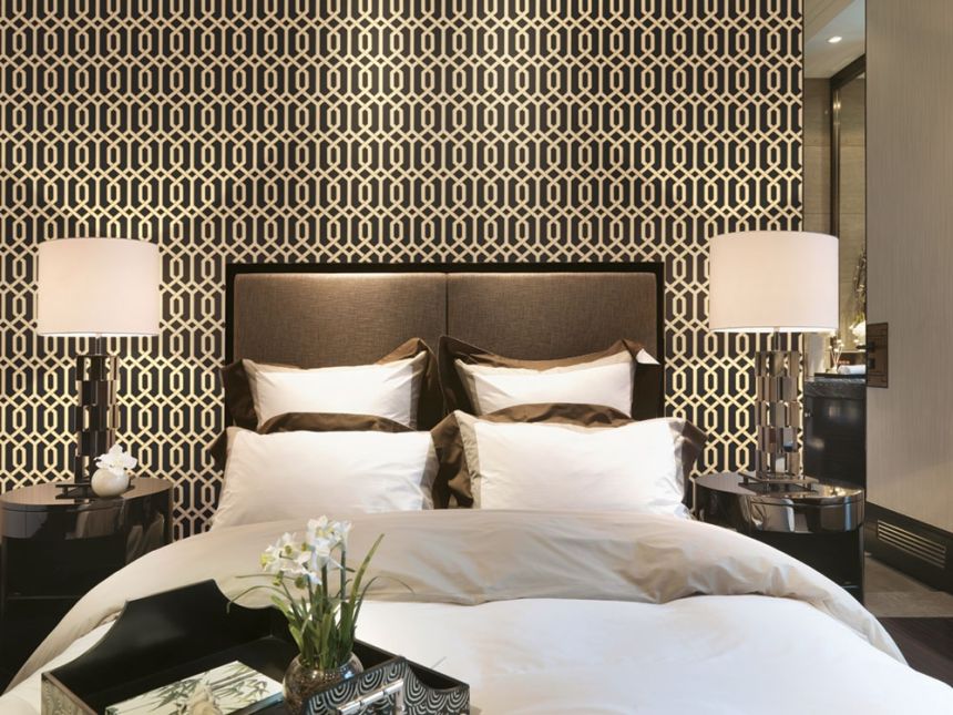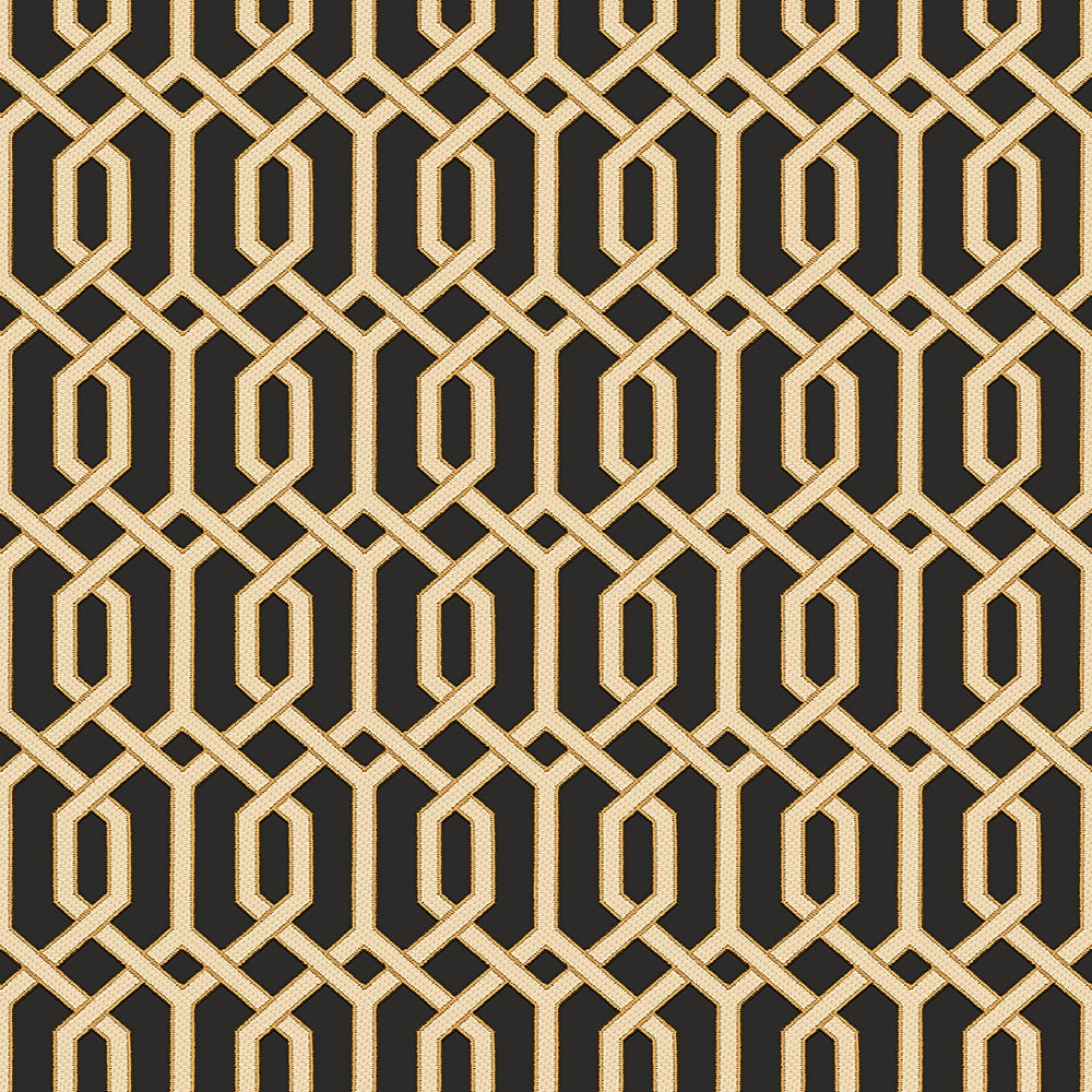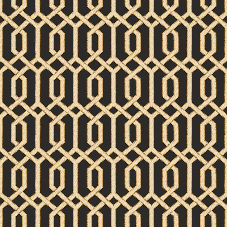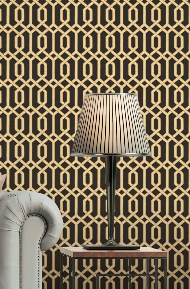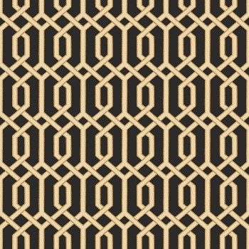 Vlies, halbglänzende schwarze Tapete mit feiner Struktur, beiges Metallic-Muster mit goldmetallischen Konturen.