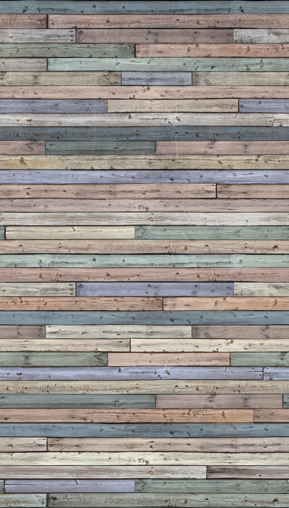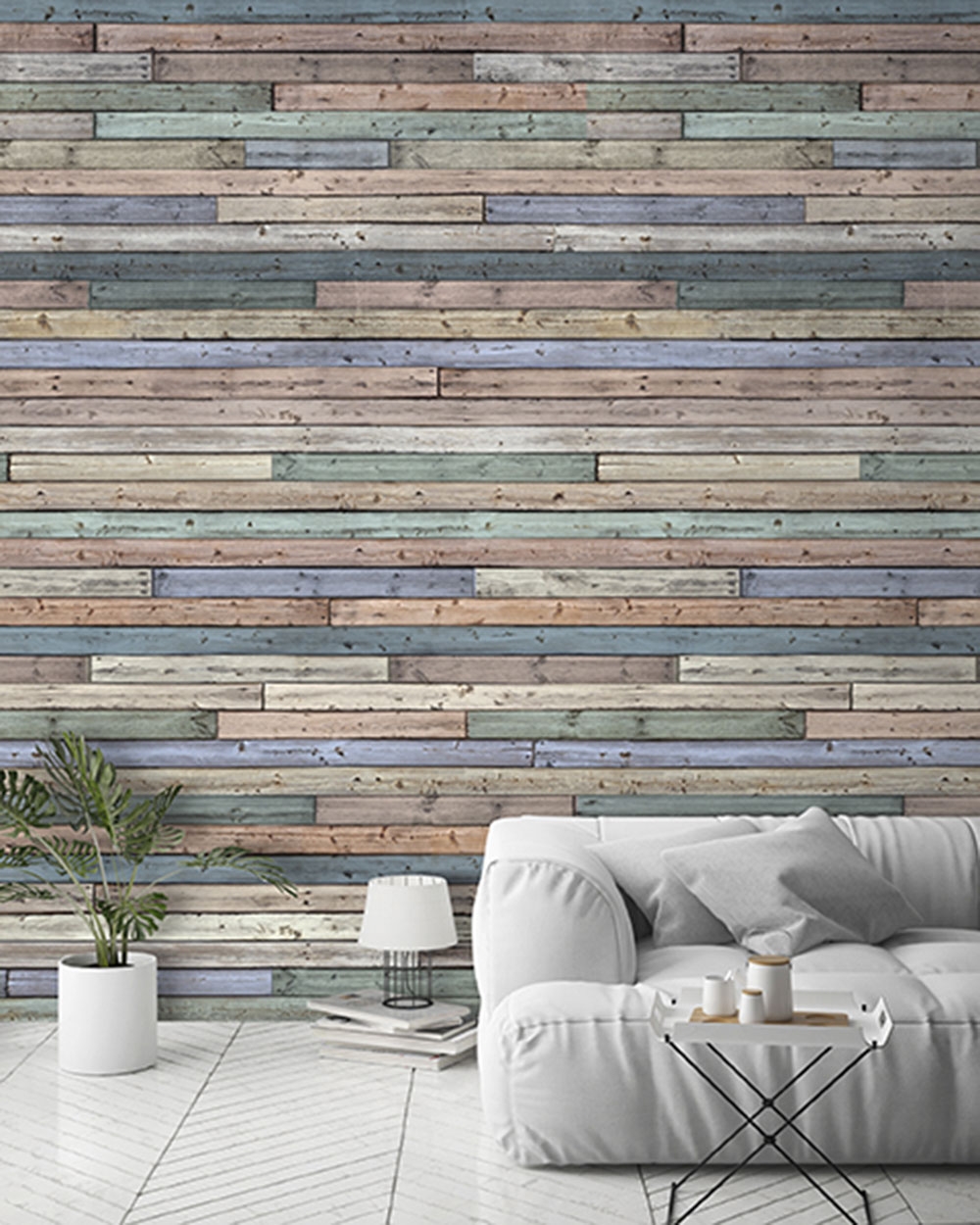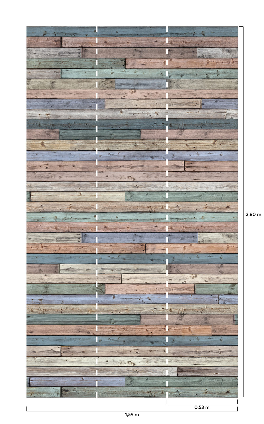 Coloured Wood – Design aus farbigen Holzbrettern. Die Tapete hat ein durchgehendes Muster, für eine größere Breite müssen Sie einfach ein weiteres Stück kaufen.