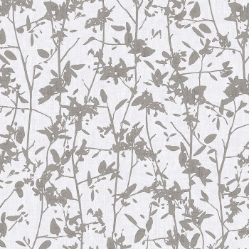 Hellgraue Vliestapete mit einem silbernen Muster aus Stängeln mit Blättern.