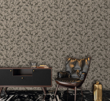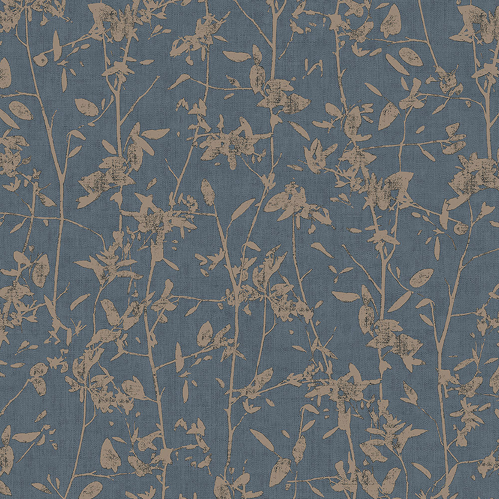 Blaue Vliestapete mit goldenen Stielen mit Blättern.