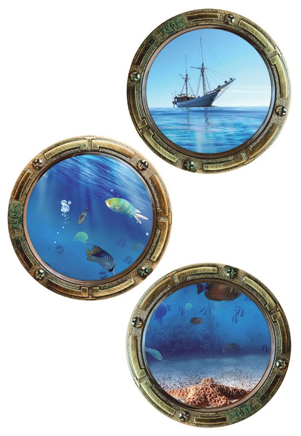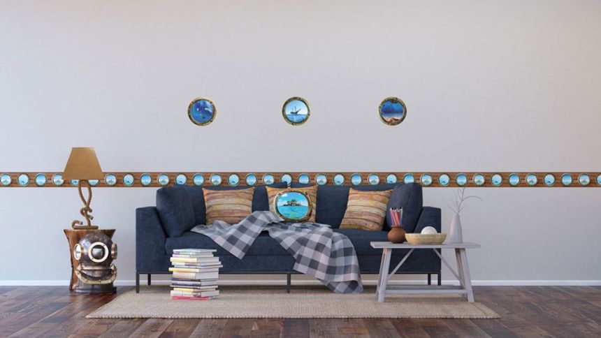 Selbstklebende Wanddekoration 42,5 x 65 cm, Schiffsfenster. Ändern Sie schnell und einfach das Aussehen Ihres Interieurs! Wir empfehlen, auf einer glatten Oberfläche zu kleben.
