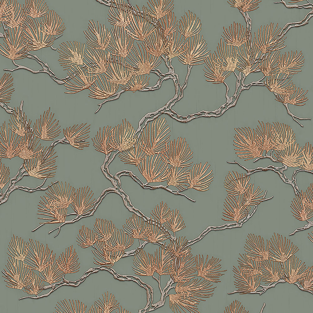 Luxuriöse graugrüne Vliestapete mit Vinyloberfläche, halbglänzendem Kupfer und grauen Baumzweigen.