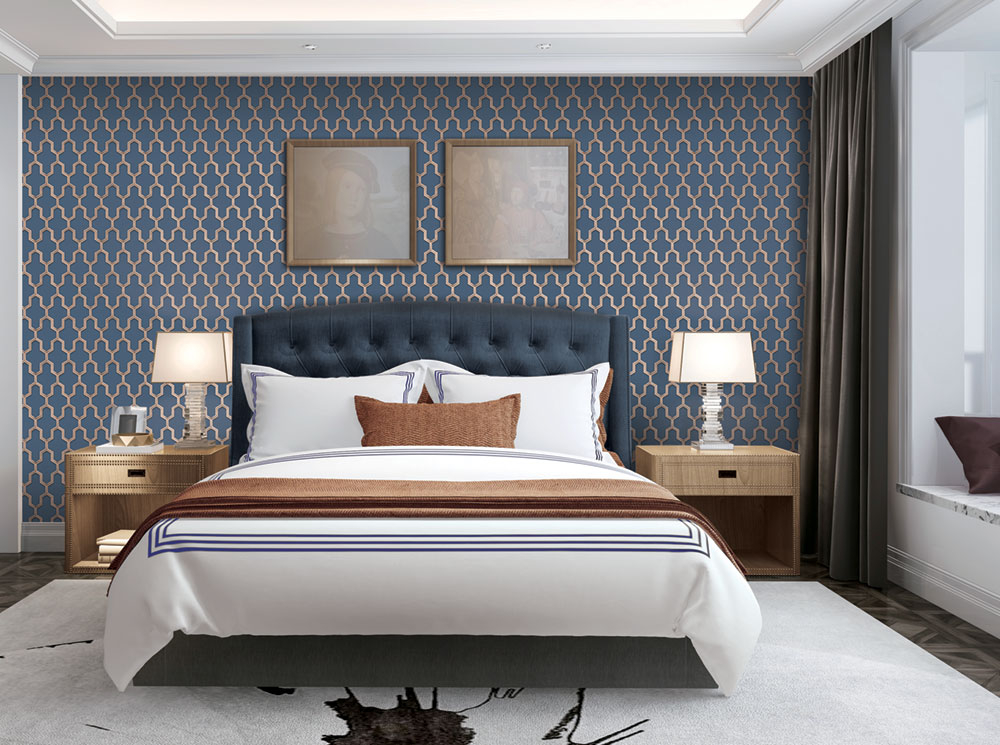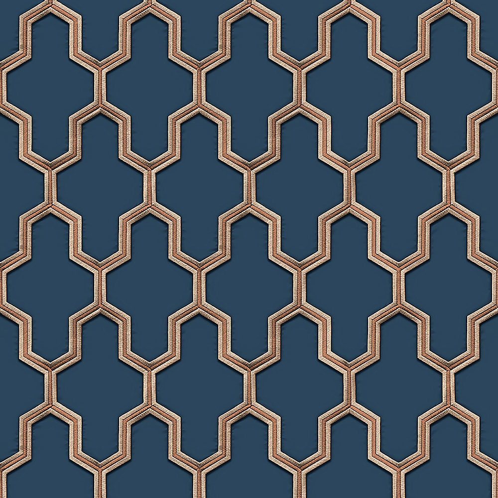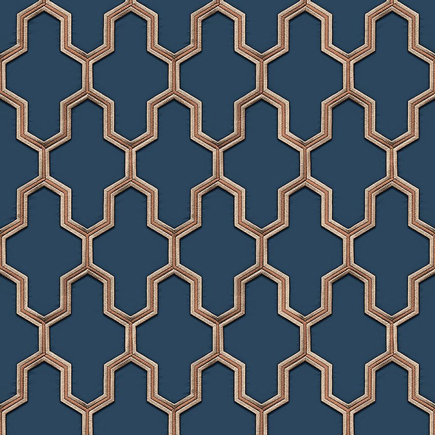 Braun-beige Stickmuster im Art déco-Stil auf Vliestapete mit blauem Hintergrund.