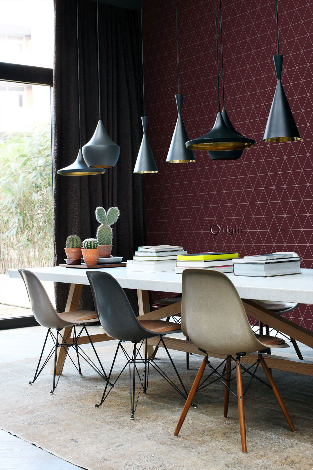 Weinrote Tapete, silberne Umrisse von Dreiecken 347718, City Chic, Origin