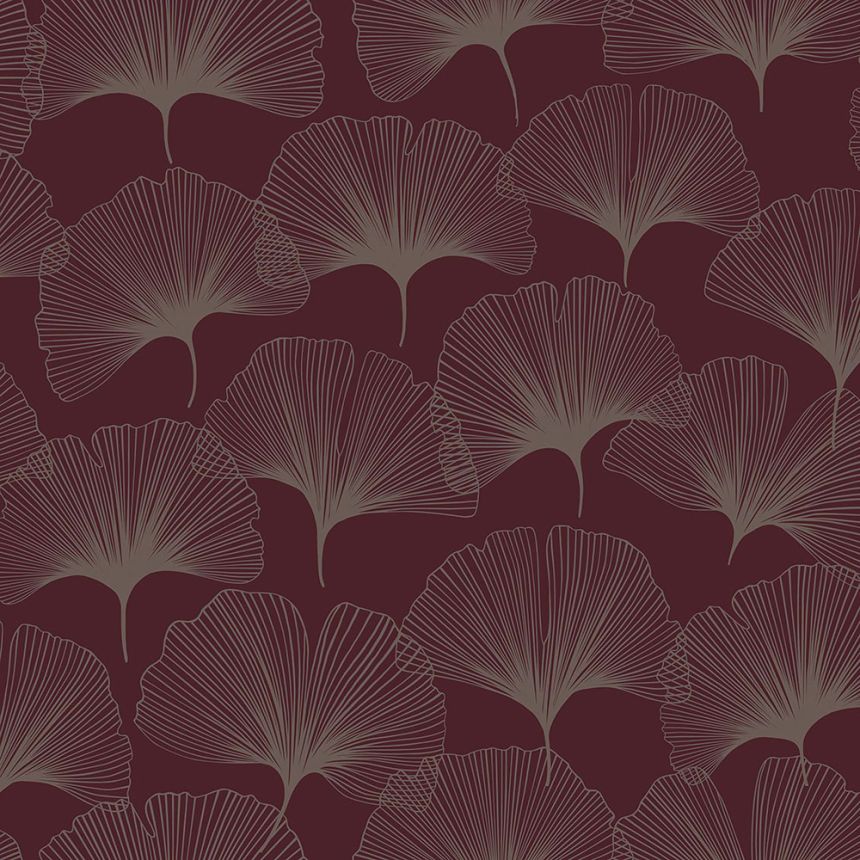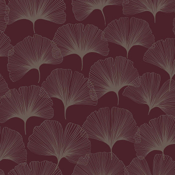 Weinfarbene Vliestapete, metallisch-silberne Umrisse von Ginkgo-Blättern.