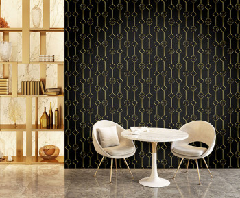 Luxuriöse schwarze Fototapete mit goldenem geometrischem Muster und PP-Logos.
