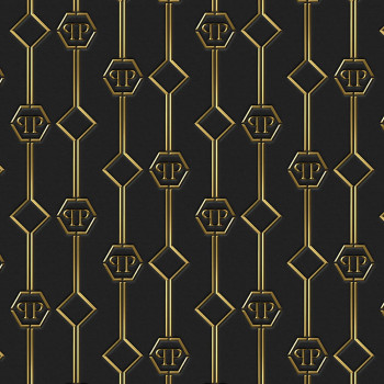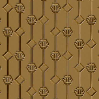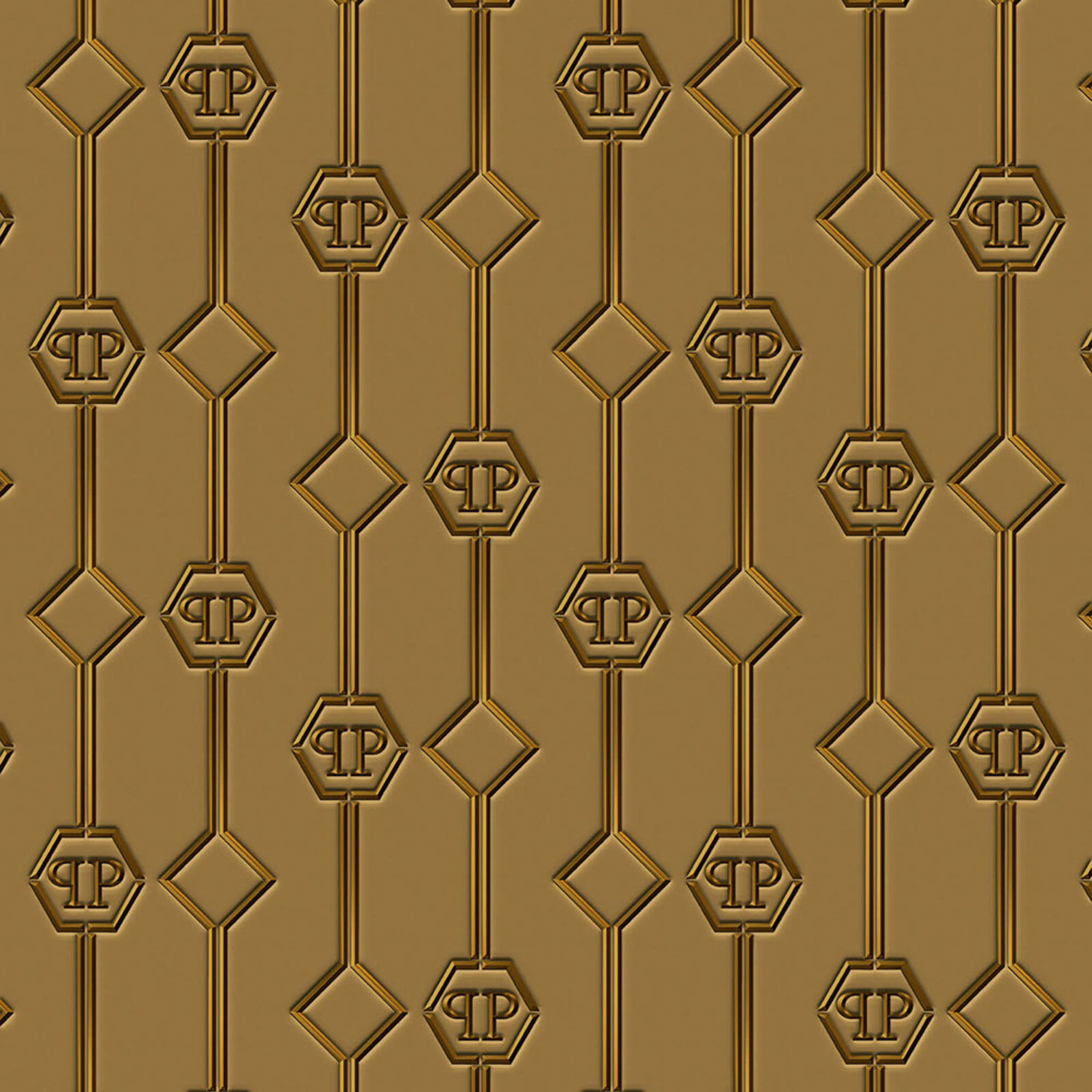 Luxuriöse goldene Fototapete mit goldenem geometrischem Muster und PP-Logos.