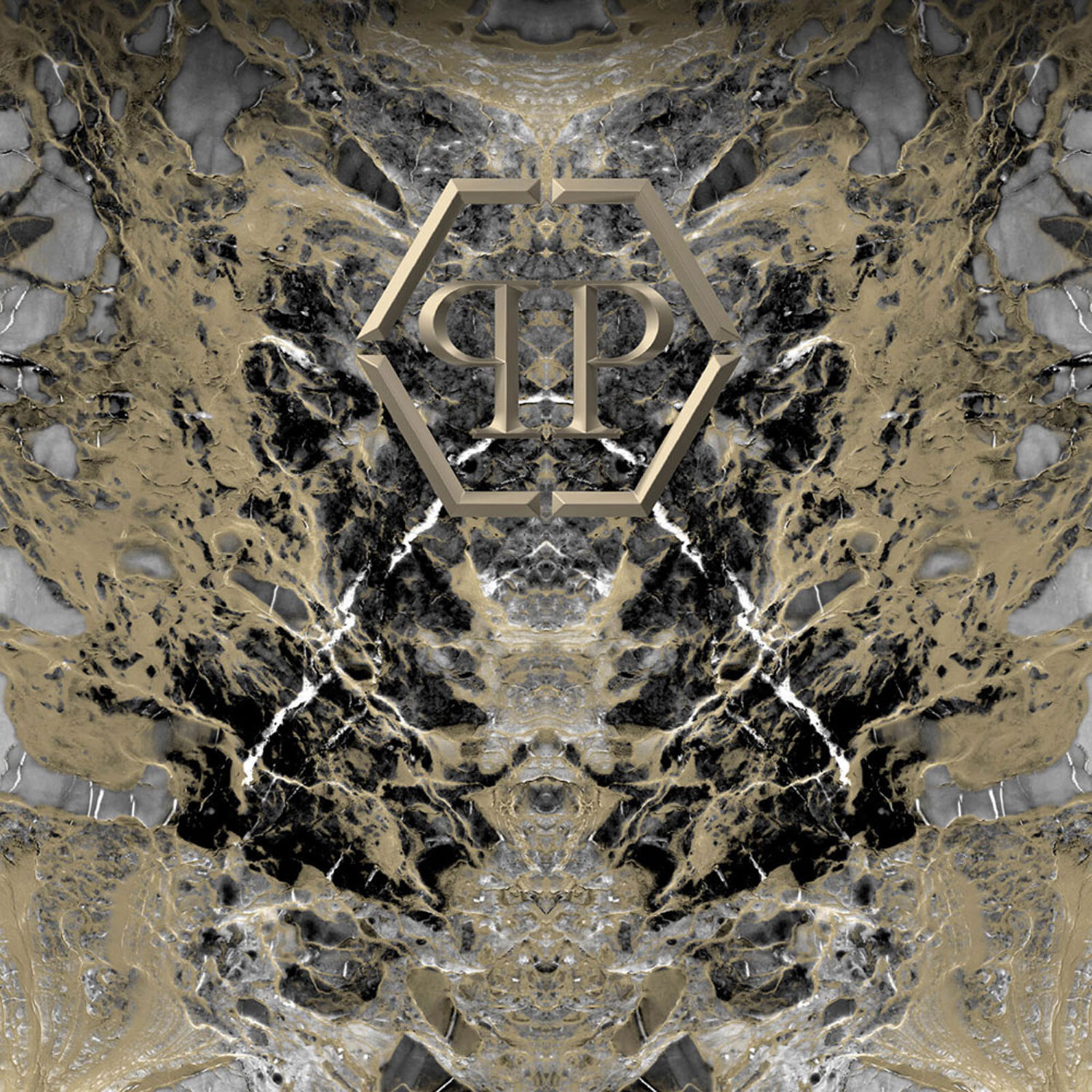 Luxuriöse Fototapete mit Marmormotiv und dem PP-Logo auf grau strukturiertem Hintergrund.