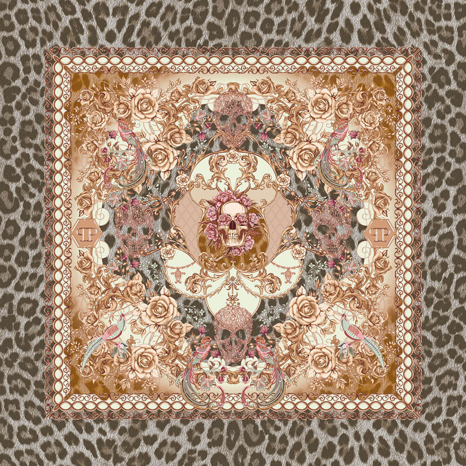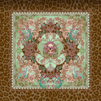 Luxuriöse Fototapete mit floralem Ornamentmotiv und Totenköpfen auf strukturiertem Leoparden-Hintergrund.