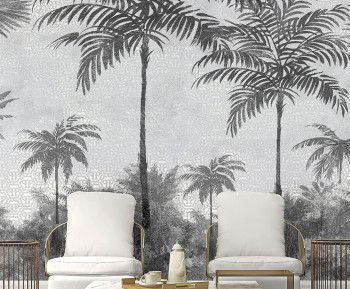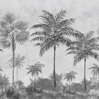 Luxuriöse Fototapete in Grautönen mit Palmenmotiv, PP-Logo. Hintergrund mit grober Textilstruktur.