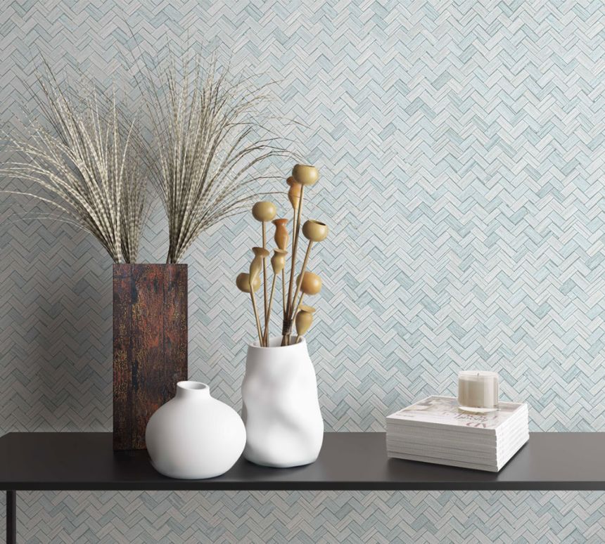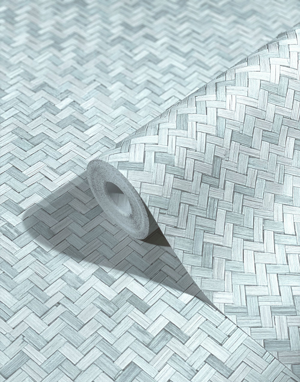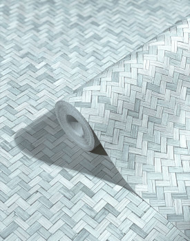 Luxuriöse, graublaue Vliestapete mit Vinyloberfläche - Rattan geflochten.
