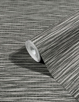 Luxuriöse Vliestapete mit Vinyloberfläche - gewebtes Raffiamuster in Schwarz- und Grautönen, manchmal mit feinem Silberglanz.