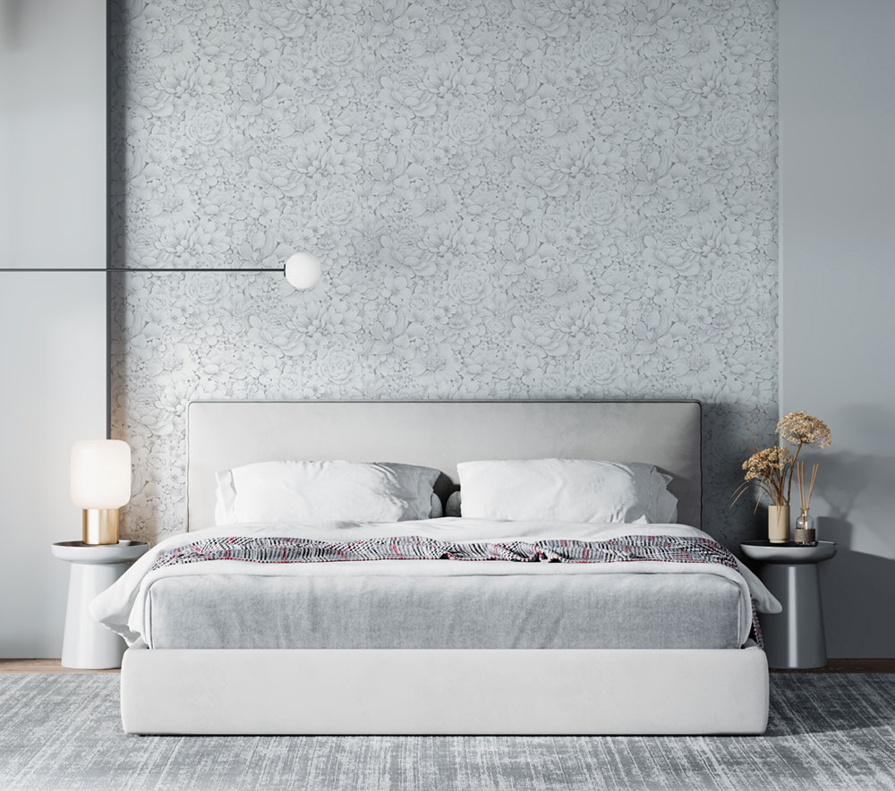 Luxuriöse, grauweiße florale Vliestapete mit Vinyloberfläche.