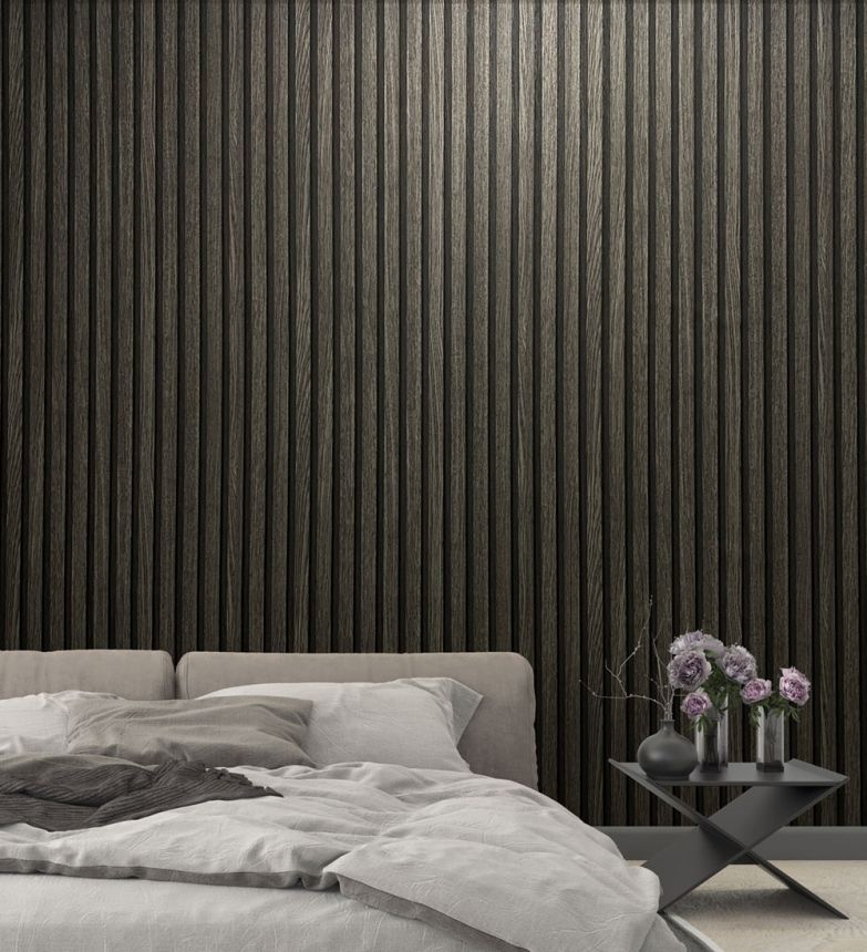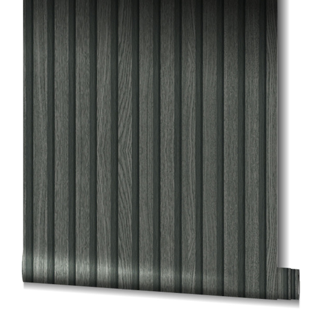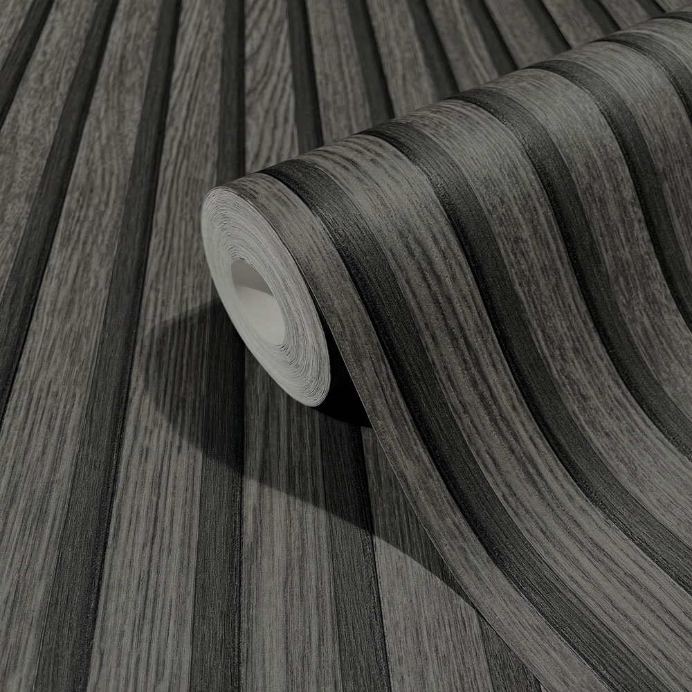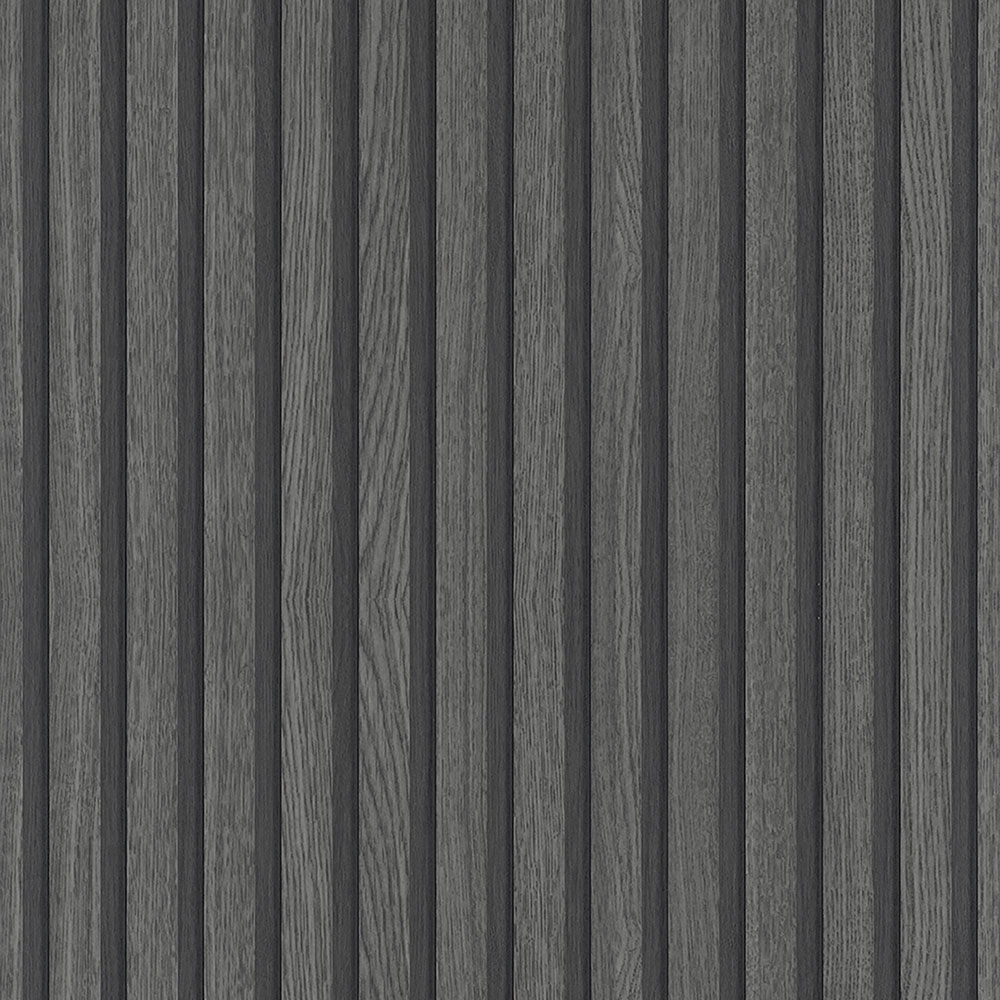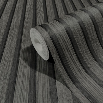 Graubraune 3D-Vliestapete mit Holzoptik.