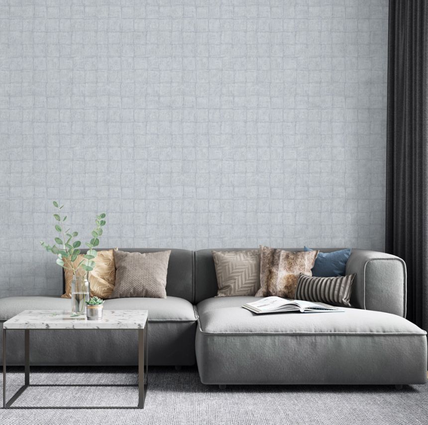 Luxus grau-blaue Vliestapete mit Vinyloberfläche, Stoffstruktur, Würfelmuster.