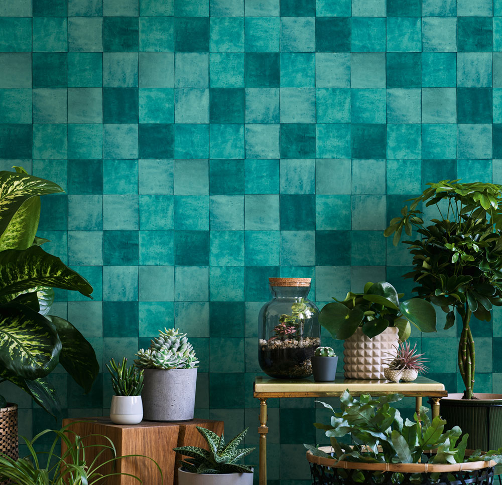 Luxuriöse, grobstrukturierte Vliestapete mit Vinyloberfläche mit türkisfarbenem Fliesendesign. Fliesengröße ca. 10,5x10,5cm.