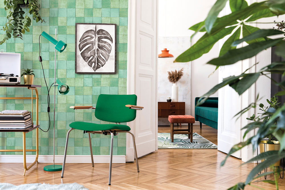 Luxuriöse, grobstrukturierte Vliestapete mit Vinyloberfläche mit grünem Fliesendesign. Fliesengröße ca. 10,5x10,5cm.