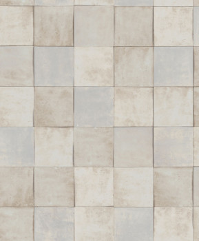 Luxuriöse, grobstrukturierte Vliestapete mit Vinyloberfläche mit hellgrau-blauen Fliesendesign. Fliesengröße ca. 10,5x10,5cm.