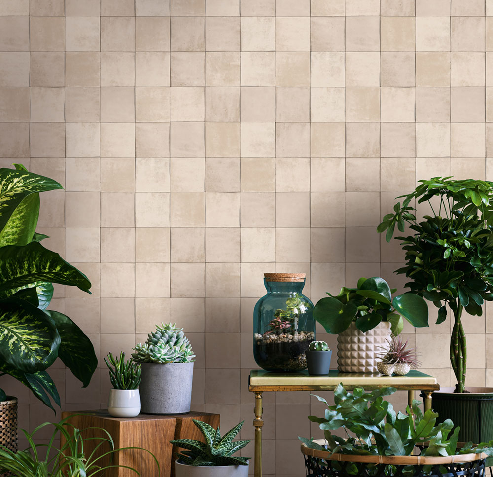 Luxuriöse, grobstrukturierte Vliestapete mit Vinyloberfläche mit beigefarbenem Fliesendesign. Fliesengröße ca. 10,5x10,5cm.