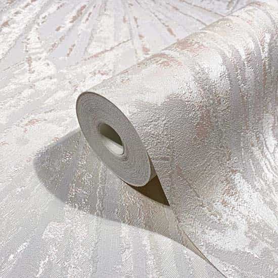 Cremefarbene Vliestapete mit Vinyloberfläche und altrosa Details, inspiriert von einem Palmblatt, das durch den Kontrast von feinen Metallic-Linien auf einem matten Hintergrund besonders interessant ist.