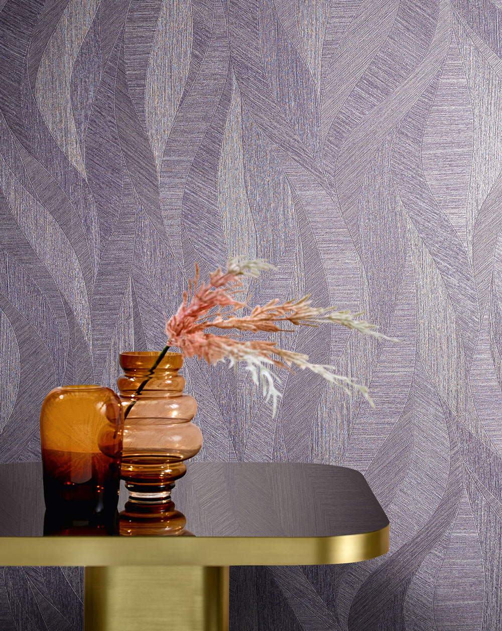 Violette Vliestapete mit Vinyloberfläche und einem Wellenmuster, das an die vom Wind in den Wüstensand gezeichneten Linien oder die sanften Kämme der Dünen erinnert.