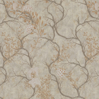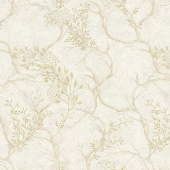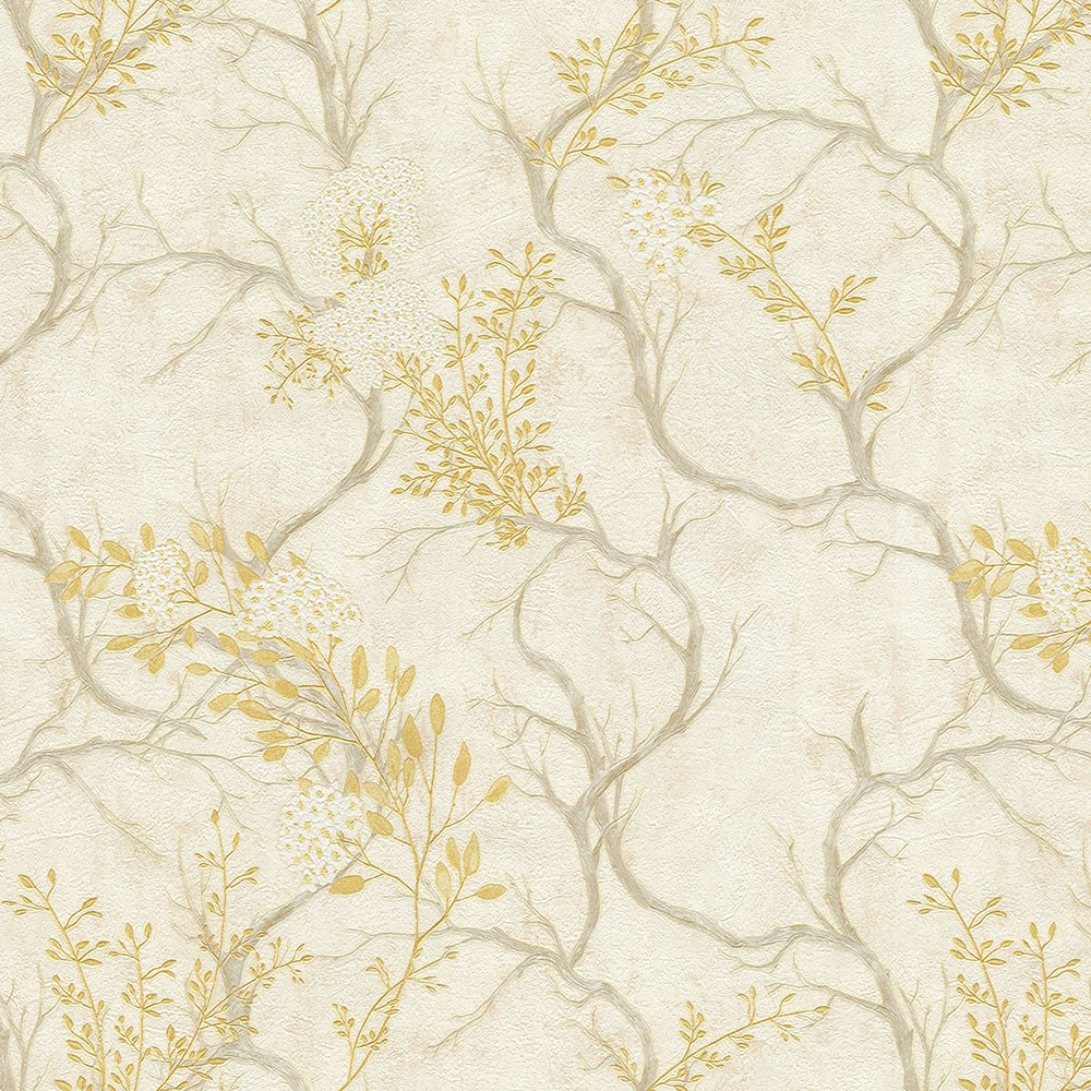 Luxuriöse, strukturierte, cremefarbene Stucktapete mit Vinyloberfläche, Motiv blühender Baumzweige, goldgelbe Details.