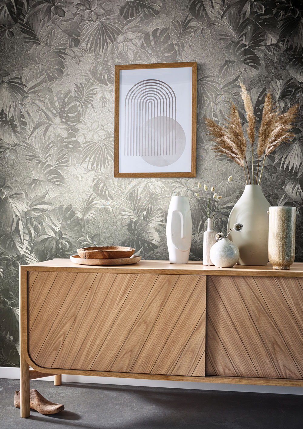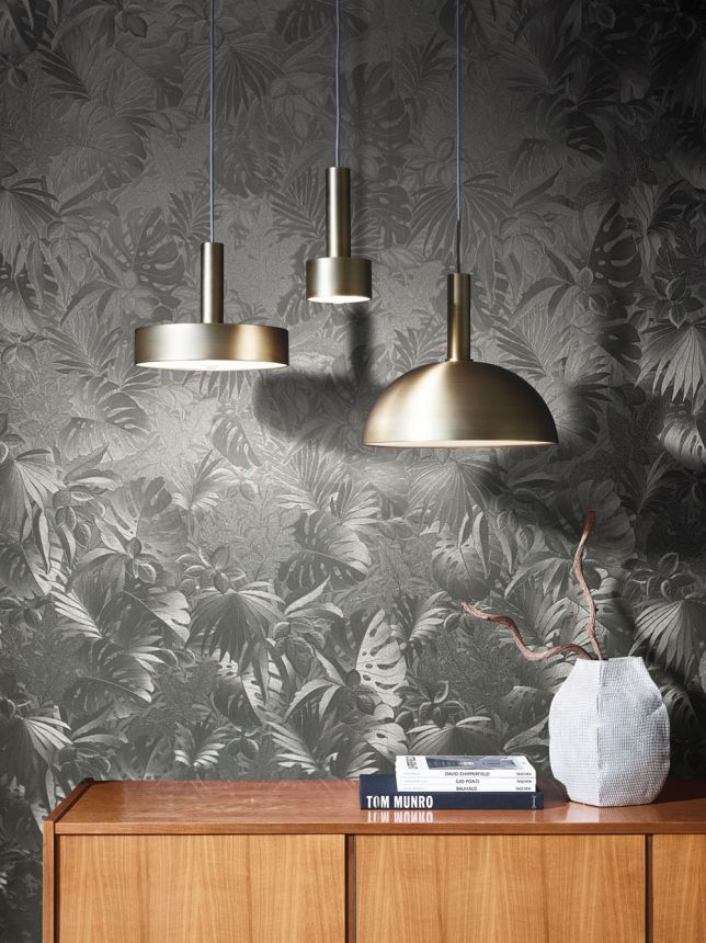 Luxuriöse Vliestapete mit Vinyloberfläche, Muster mit Blättern, metallischer Glanz.