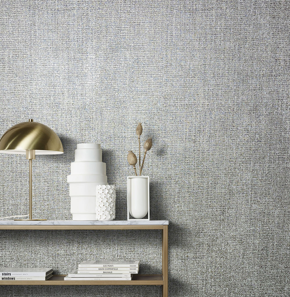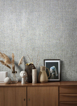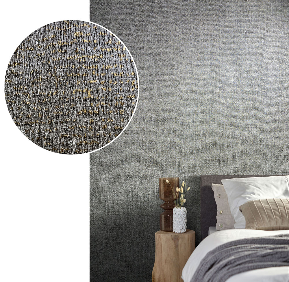 Luxuriöse grau-goldene Wolltapete, Imitation von grobem Stoff.