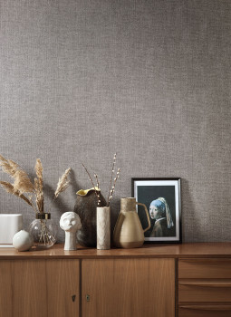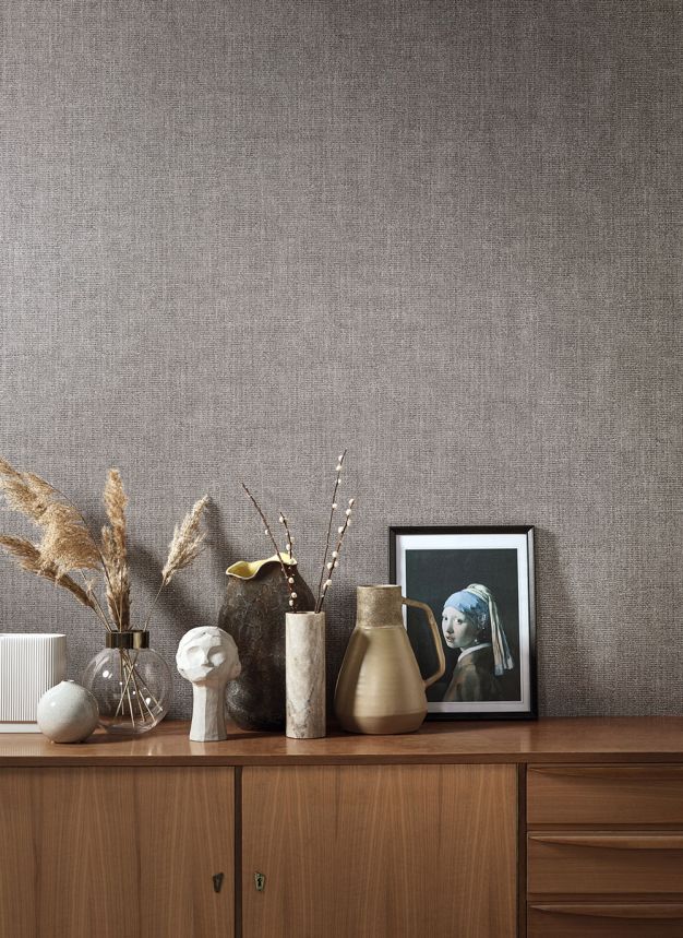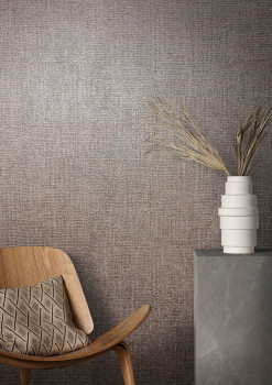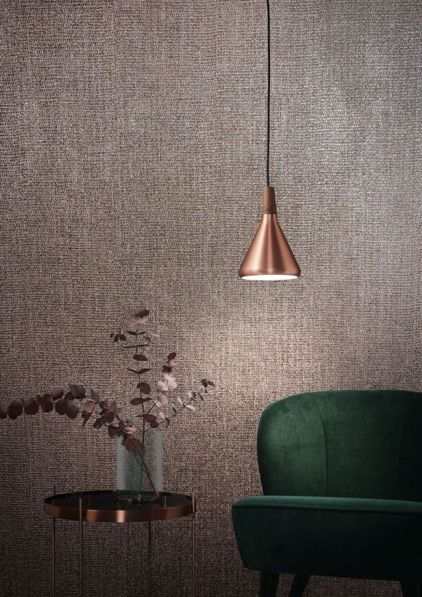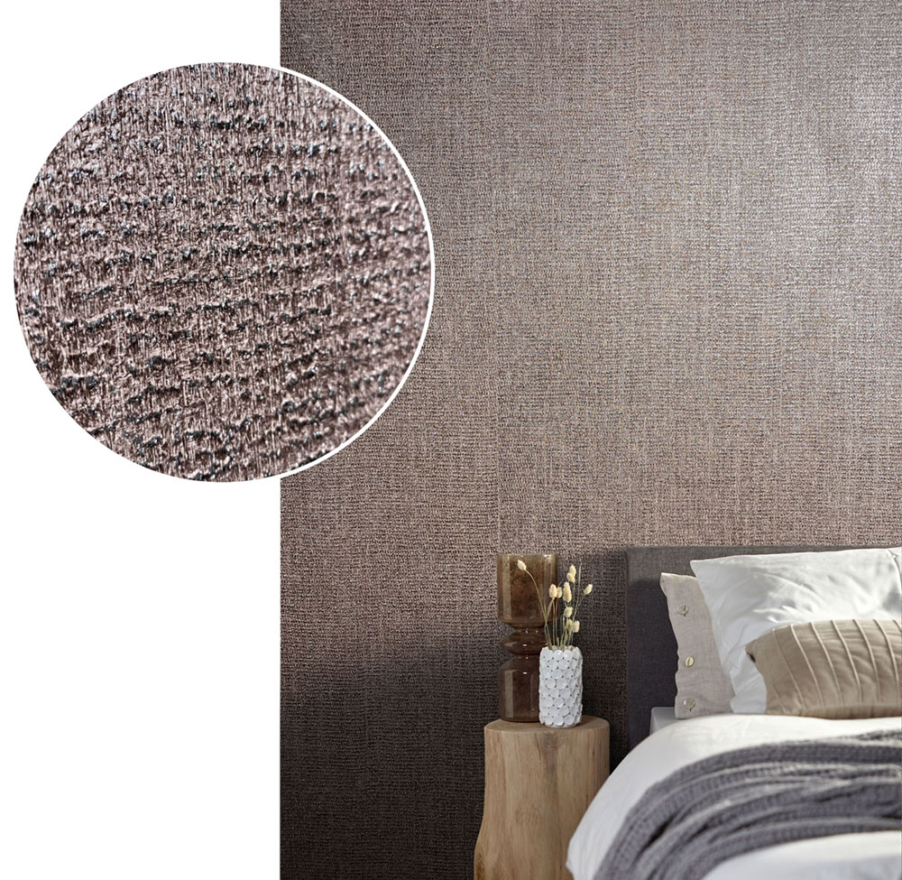 Luxuriöse Metallic-Vliestapete, grobe Stoffimitation in metallischen Altrosa- und Silbertönen.